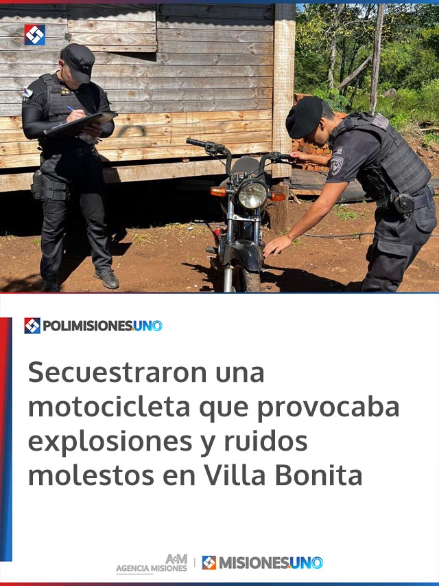 AGENCIA MISIONES.UNO | Efectivos de la Comisaría y de la División Comando Radioeléctrico de Villa Bonita secuestraron una motocicleta que era utilizada para realizar maniobras peligrosas y generar fuertes explosiones con el caño de escape sobre la Ruta Provincial 103, situación que generaba reiteradas quejas entre los vecinos de la zona.