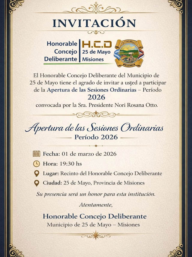 AGENCIA MISIONES.UNO | El Honorable Concejo Deliberante de 25 de Mayo invitó a la comunidad a participar de la Apertura de las Sesiones Ordinarias – Período 2026, convocada por la presidente Nori Rosana Otto. El acto se realizará el 1 de marzo a las 19:30 horas en el recinto del cuerpo legislativo.