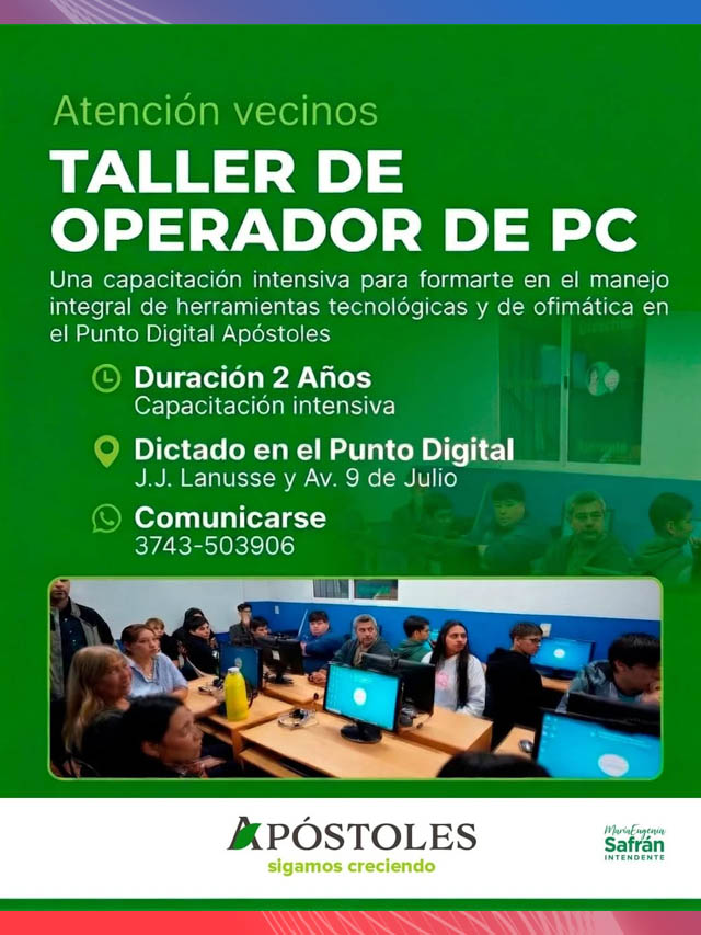 AGENCIA MISIONES.UNO | La Municipalidad de Apóstoles anunció la apertura de inscripciones para el Taller de Operador de PC, una propuesta de formación orientada a brindar herramientas digitales para el estudio y el trabajo.