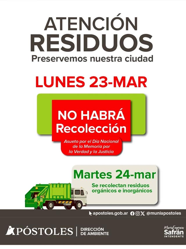 AGENCIA MISIONES.UNO | La Municipalidad de Apóstoles informó que este lunes 23 de marzo no se prestará el servicio de recolección de residuos debido a que se trata de un día no laborable.