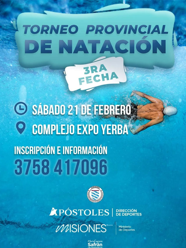 AGENCIA MISIONES.UNO | Este sábado 21 de febrero, Apóstoles recibirá la 3ª Fecha del Torneo Provincial de Natación, con la participación de nadadores provenientes de distintos puntos de Misiones. La competencia se desarrollará en el Complejo Expo Yerba y las inscripciones permanecen abiertas.