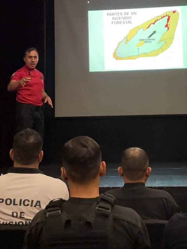 Durante las capacitaciones se abordaron protocolos de actuación frente a incendios forestales, incendios en estructuras y casos de personas con fuego sobre el cuerpo, con el objetivo de preparar al personal policial como primer interviniente ante este tipo de emergencias.