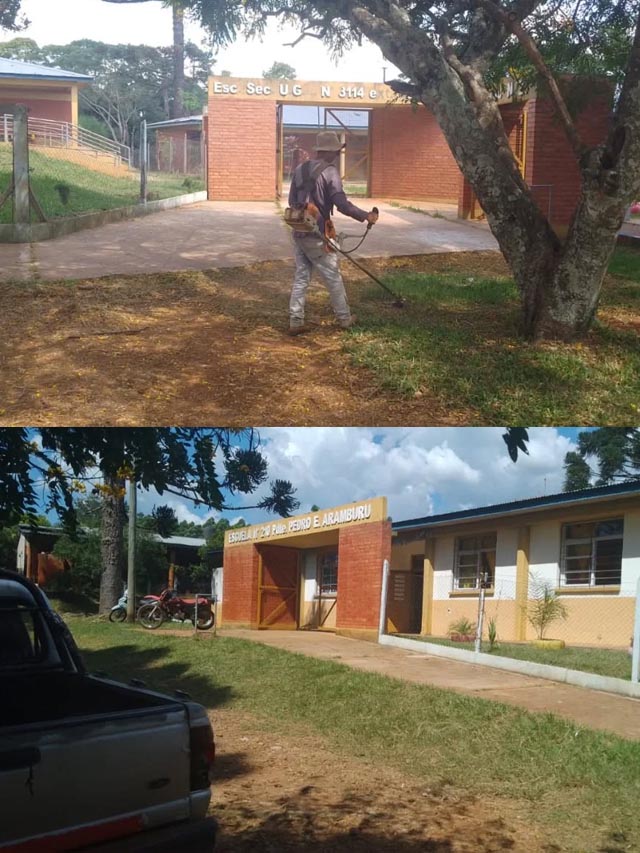 AGENCIA MISIONES.UNO | La Municipalidad de Bernardo de Irigoyen llevó adelante operativos de limpieza en distintos establecimientos educativos, con tareas de desmalezamiento, corte de pasto y acondicionamiento general de los espacios.