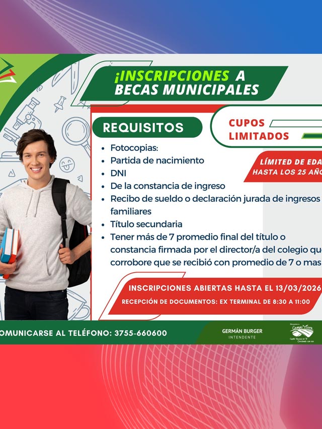 La fecha límite para la presentación de la documentación es el viernes 13 de marzo de 2026. Los trámites deberán realizarse de manera presencial en la Ex Terminal, en el horario de 8:30 a 11:00 horas. Para consultas, el municipio habilitó el número telefónico 3755-660600. Desde la gestión municipal destacaron que la iniciativa forma parte de una política orientada a fortalecer la educación como motor de crecimiento y desarrollo para la comunidad.