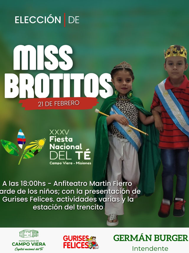 La ciudad de Campo Viera se prepara para vivir una nueva edición de la Elección Miss Brotitos, que se desarrollará este sábado 21 de febrero en el Anfiteatro Martín Fierro, a partir de las 18:00, en el marco de la Tarde de los Niños.