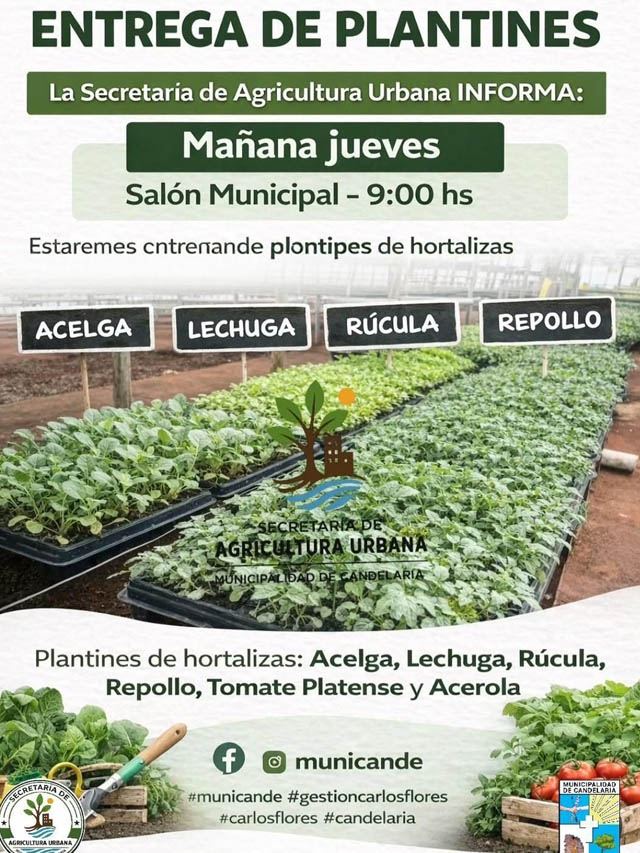AGENCIA MISIONES.UNO | La Secretaría de Agricultura Urbana de la Municipalidad de Candelaria realizará este jueves a las 9:00 una entrega de plantines en el Salón Municipal, destinada a vecinos de la ciudad.