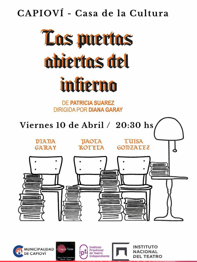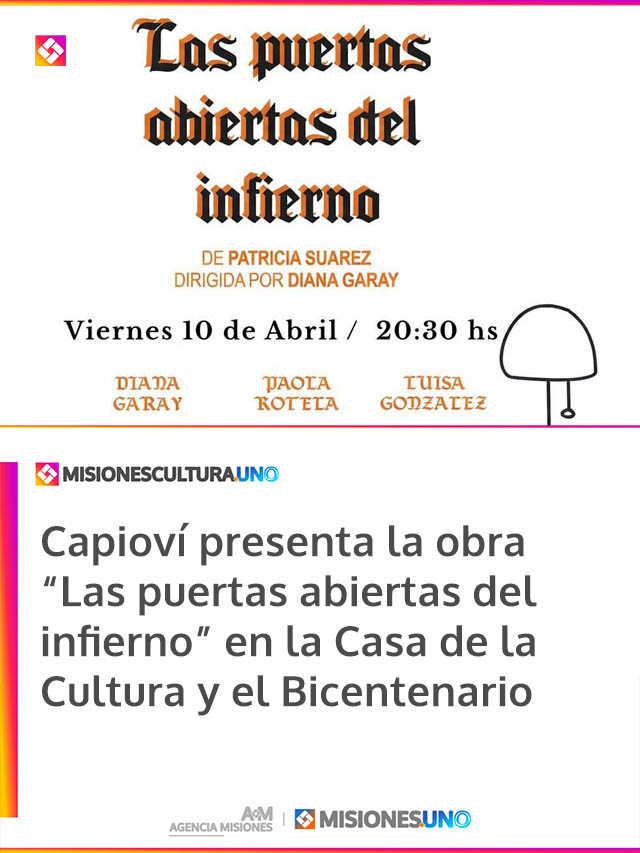 AGENCIA MISIONES.UNO | El próximo viernes 10 de abril a las 20.30 horas se presentará en la Casa de la Cultura y el Bicentenario de Capioví la obra teatral “Las puertas abiertas del infierno”, con el acompañamiento del Instituto Nacional del Teatro, la Municipalidad local y el Instituto Provincial del Teatro Independiente.