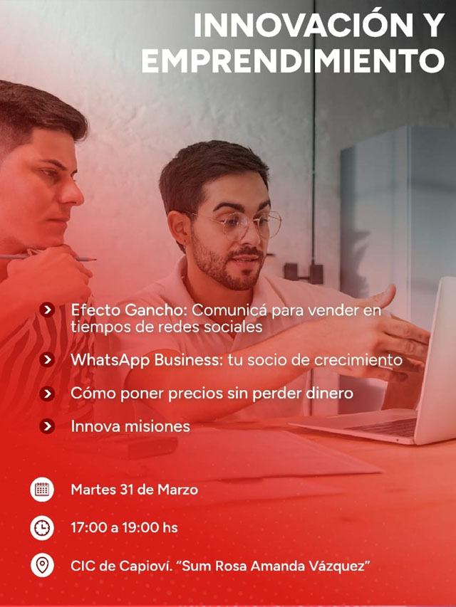 El próximo martes 31 de marzo, a partir de las 17.00 horas, se llevará a cabo en el Centro Integrador Comunitario (CIC) de Capioví el “Encuentro de Innovación y Emprendimiento”, una propuesta destinada a quienes buscan potenciar sus iniciativas productivas y adquirir nuevas herramientas.