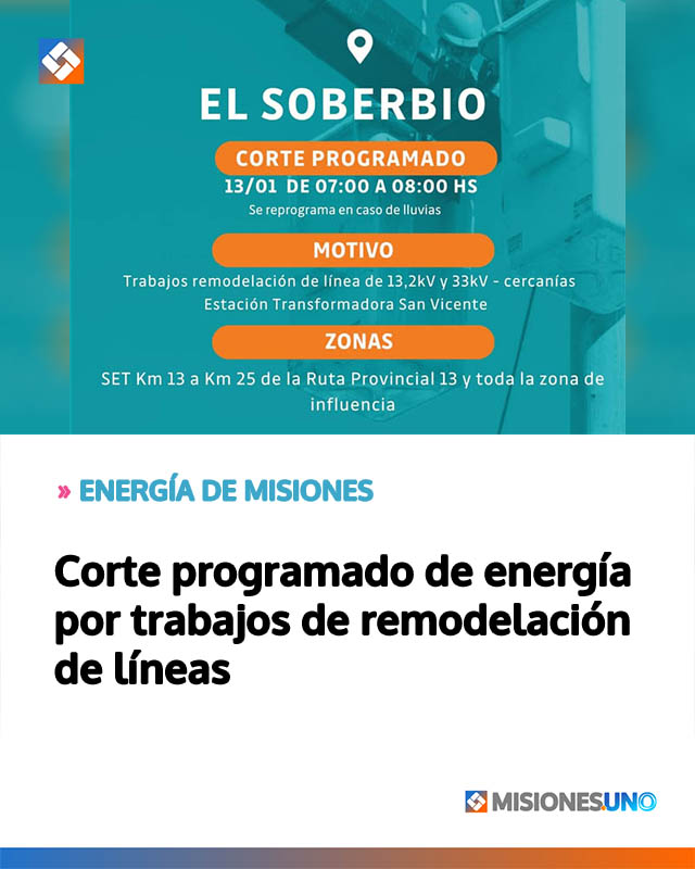 AGENCIAMISIONES.UNO | Energía de Misiones informó que este martes 13 de enero se realizará un corte programado del servicio eléctrico en la localidad de El Soberbio, entre las 7 y las 8 horas, sujeto a reprogramación en caso de lluvia.