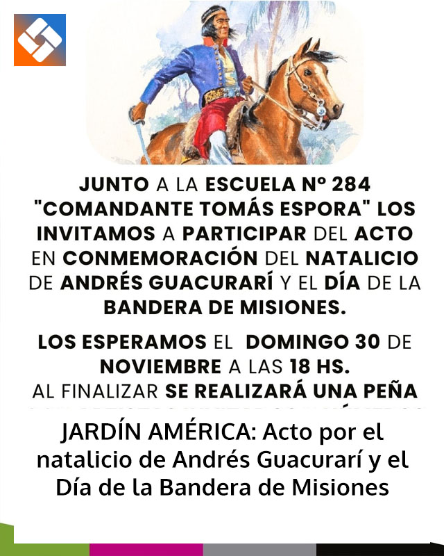 MISIONES.UNO | En Jardín América se realizará este domingo 30 de noviembre un acto en homenaje al natalicio de Andrés Guacurarí y al Día de la Bandera de Misiones junto a la Escuela N.º 284 “Comandante Tomás Espora”. La jornada concluirá con una peña artística que contará con la participación de alumnos y artistas invitados.