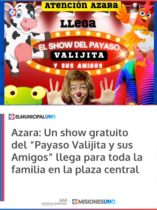 MISIONES.UNO - En Azara, el próximo domingo 8 de febrero se presentará en la Plaza San Martín el espectáculo gratuito del “Payaso Valijita y sus Amigos”, una propuesta pensada para disfrutar en familia durante las vacaciones de verano.