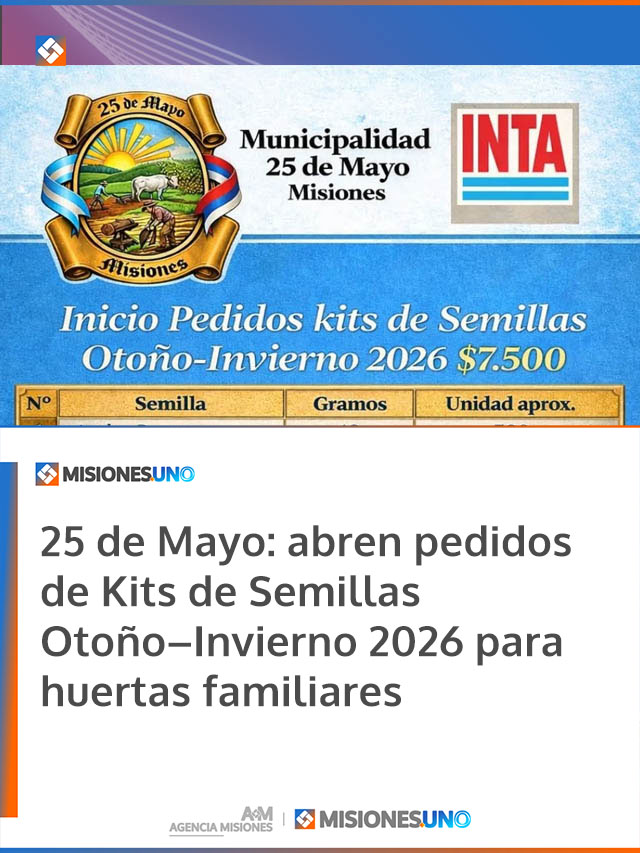 AGENCIA MISIONES.UNO | La Secretaría del Agro y la Producción de la Municipalidad de 25 de Mayo informó que se encuentra abierta la recepción de pedidos de los Kits de Semillas Otoño–Invierno 2026, con un valor de $7.500 por unidad y modalidad de pago adelantado presencial.