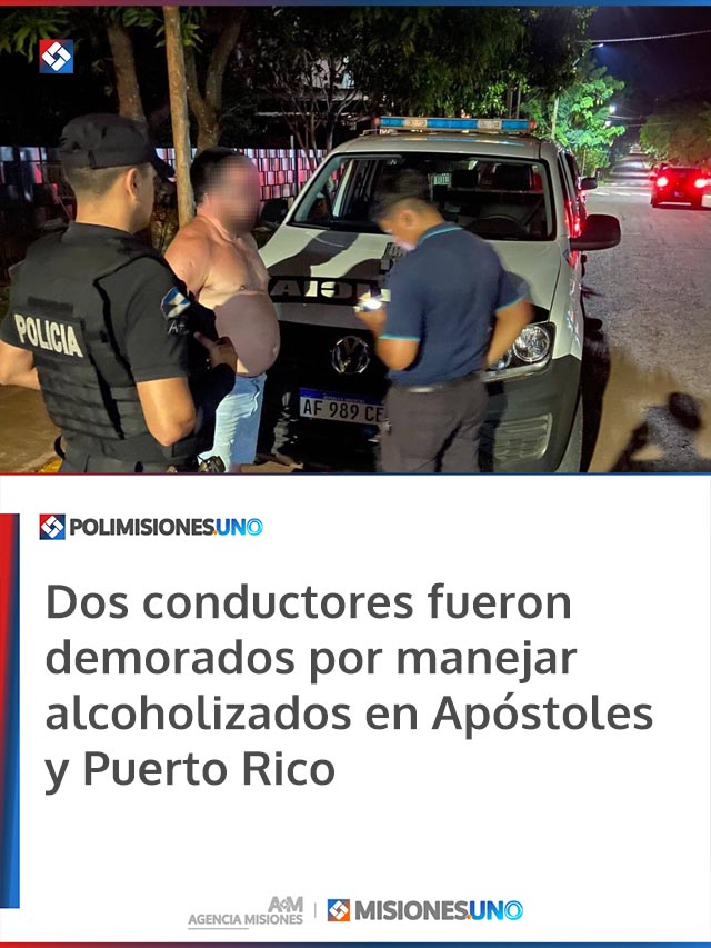 AGENCIA MISIONES.UNO | En distintos procedimientos realizados el domingo por la noche, la Policía intervino ante dos conductores que circulaban bajo los efectos del alcohol. Uno protagonizó maniobras temerarias y terminó chocando en un balneario de Apóstoles, mientras que en Puerto Rico otro automovilista fue interceptado en pleno centro con más de cuatro veces el límite permitido de alcohol en sangre.