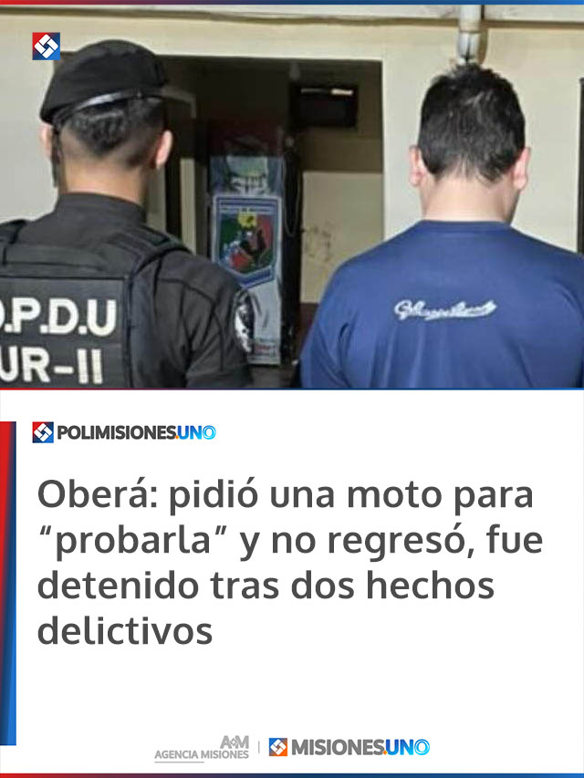 AGENCIA MISIONES.UNO | Un hombre de 29 años fue detenido este martes en Oberá, acusado de haber robado una motocicleta tras simular una compra y de engañar a un remisero para sustraerle dinero en efectivo. El sospechoso, con antecedentes penales, había recuperado la libertad meses atrás.