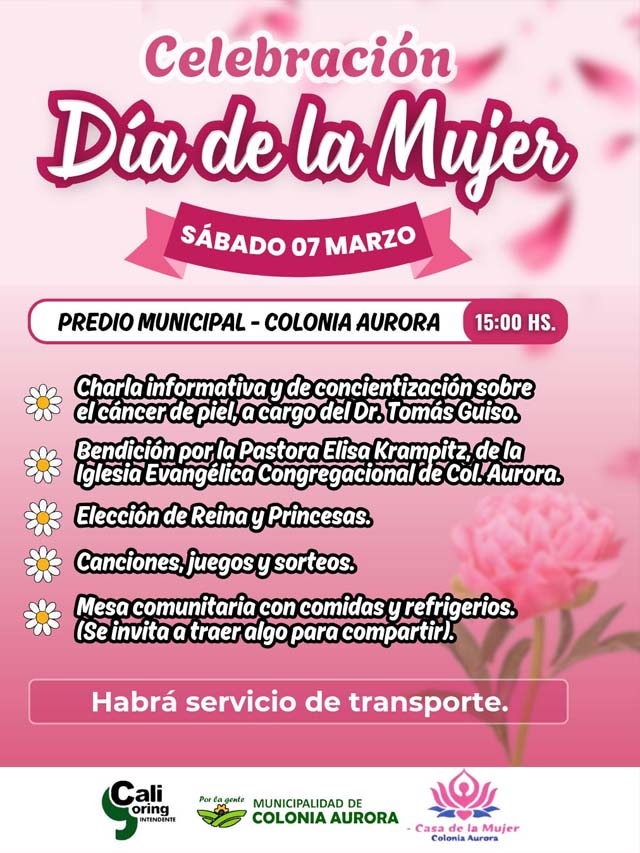 Desde la organización informaron que habrá transporte disponible para facilitar la asistencia de quienes deseen participar. La actividad se enmarca en las acciones impulsadas por la gestión municipal encabezada por Cali Goring, con el acompañamiento de la Casa de la Mujer, promoviendo espacios de encuentro y reconocimiento del aporte de las mujeres a la comunidad.
