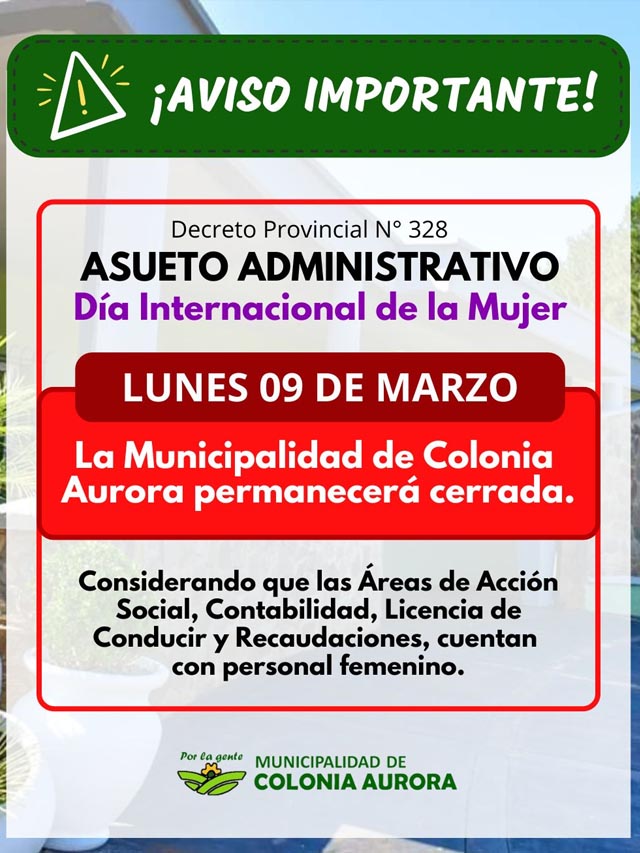 AGENCIA MISIONES.UNO | La Municipalidad de Colonia Aurora informó que el lunes 9 de marzo permanecerá cerrada debido a un asueto administrativo dispuesto en el marco del Día Internacional de la Mujer, conforme a lo establecido por el Decreto Provincial N° 328.