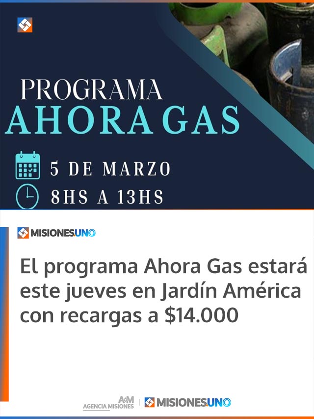AGENCIA MISIONES.UNO | El Programa Provincial Ahora Gas llegará este jueves a Jardín América y atenderá de 8:00 a 13:00 en el Polideportivo Municipal, con un valor de recarga establecido en 14.000 pesos.