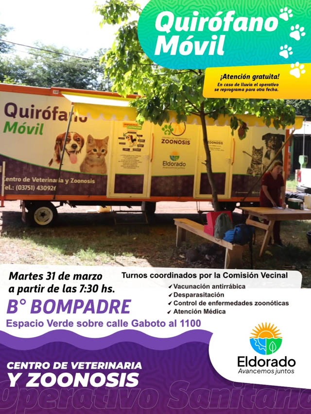 AGENCIA MISIONES.UNO | La Municipalidad de Eldorado llevará adelante un nuevo operativo del Quirófano Veterinario Móvil, destinado a la esterilización de mascotas en el barrio Bompadre.