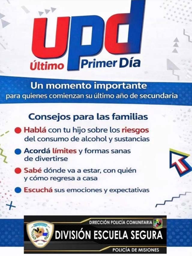 Asimismo, desde la División Escuela Segura se brindaron recomendaciones destinadas a concientizar a la comunidad, especialmente a las familias, sobre la importancia de acompañar y supervisar este tipo de festejos, priorizando la seguridad de los estudiantes en el inicio del nuevo ciclo lectivo.