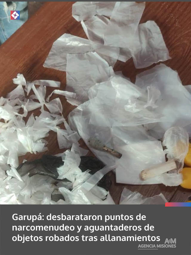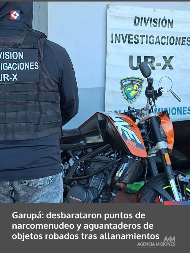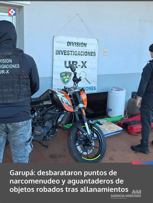 AGENCIA MISIONES.UNO | Una investigación por delitos contra la propiedad derivó en dos allanamientos simultáneos en Garupá, donde la Policía desarticuló presuntos puntos de narcomenudeo y acopio de elementos robados, con secuestro de diversos objetos y una motocicleta vinculada a hechos delictivos.