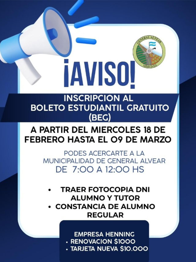 AGENCIA MISIONES.UNO | Desde este miércoles 18 de febrero y hasta el 9 de marzo estará habilitada la inscripción al Boleto Estudiantil Gratuito (BEG) en General Alvear. El trámite se realiza en la Municipalidad, de 7:00 a 12:00 horas, con presentación de documentación obligatoria.