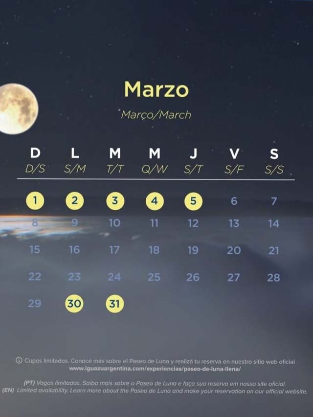 El Parque Nacional Iguazú volverá a ofrecer en marzo el tradicional Paseo de Luna Llena, una propuesta que se realiza cada mes de acuerdo al calendario lunar y que permite recorrer uno de los principales atractivos naturales del país bajo la luz de la luna. En esta oportunidad, serán siete las noches habilitadas para la actividad: 1, 2, 3, 4, 5, 30 y 31 de marzo.