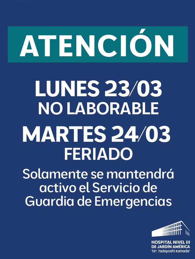 AGENCIA MISIONES.UNO | El Hospital Nivel III de Jardín América “Dr. Tadayoshi Kamada” informó que no habrá atención al público los días lunes 23 y martes 24 de marzo, debido a jornada no laborable y feriado nacional.
