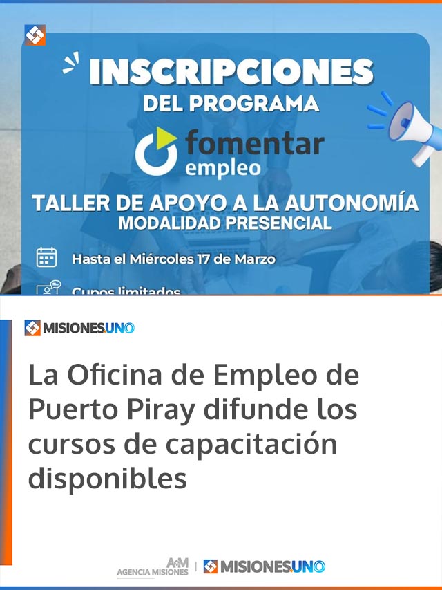 La entrada La Oficina de Empleo de Puerto Piray difunde los cursos de capacitación disponibles se publicó primero en Agencia Misiones.uno.