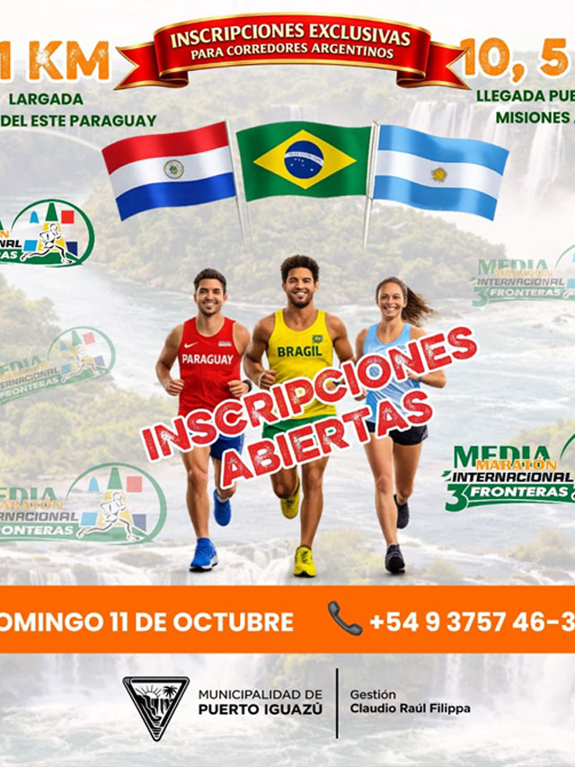 AGENCIA MISIONES.UNO | Ya se encuentran abiertas las inscripciones para participar de la Maratón Internacional 3 Fronteras, un evento deportivo que unirá a Argentina, Brasil y Paraguay, con llegada en Puerto Iguazú. La convocatoria está dirigida exclusivamente a corredores argentinos y se realizará el domingo 11 de octubre.