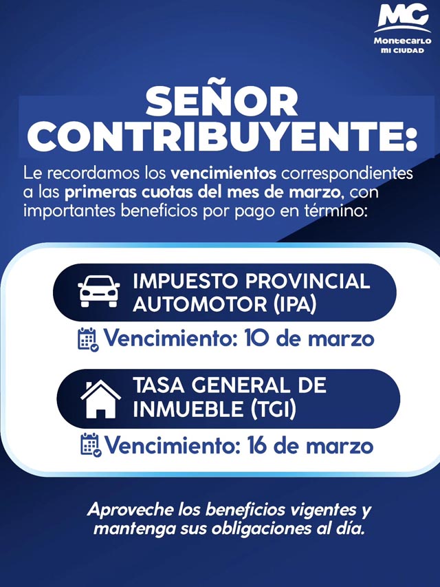 AGENCIA MISIONES.UNO | La Municipalidad de Montecarlo informó a los contribuyentes sobre los vencimientos de las primeras cuotas del mes de marzo del Impuesto Provincial Automotor (IPA) y la Tasa General de Inmueble (TGI), destacando los beneficios por pago en término.