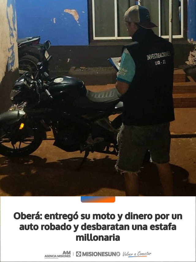 La motocicleta se encontraba en poder de una mujer de 20 años, quien fue identificada y prestó declaración testimonial en el marco de la causa. Las actuaciones continúan bajo la intervención del Juzgado de Instrucción Uno de Oberá, mientras se avanza en la identificación del autor de la estafa.