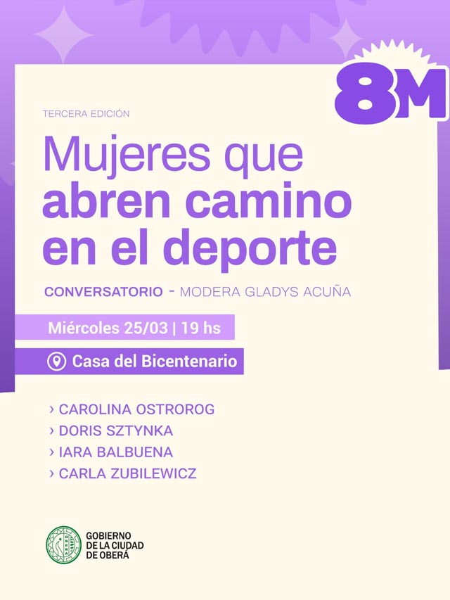 AGENCIA MISIONES.UNO | En el marco del Mes de la Mujer, el próximo miércoles 25 de marzo a las 19 horas se llevará a cabo en Oberá la tercera edición del conversatorio “Mujeres que abren camino en el deporte”, una propuesta destinada a visibilizar el rol femenino en distintas disciplinas deportivas.