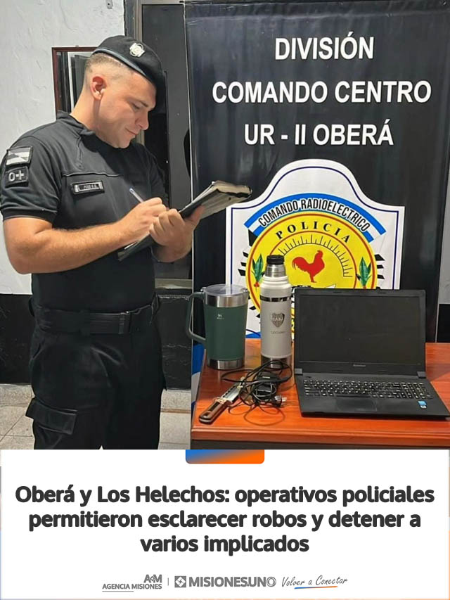 Por otra parte, en Oberá, la División Comando Radioeléctrico Zona Centro esclareció un hurto ocurrido en un vehículo. A partir de tareas investigativas, recuperaron una computadora, utensilios y efectos personales que habían sido comercializados en cercanías del lugar. El sospechoso ya fue identificado.