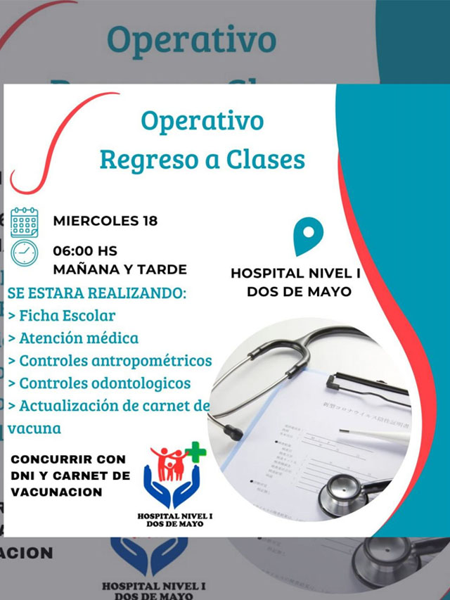 MISIONES.UNO – En Dos de Mayo, este miércoles 18 desde las 6:00 horas se llevará a cabo el operativo sanitario “Regreso a Clases” en el Hospital Nivel I, con turnos habilitados durante la mañana y la tarde para acompañar a las familias en el inicio del ciclo lectivo.