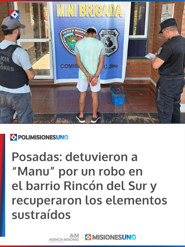 AGENCIA MISIONES.UNO | Efectivos policiales detuvieron a un joven de 23 años acusado de un robo en el barrio Rincón del Sur de Posadas, en un procedimiento que permitió además recuperar los objetos sustraídos.