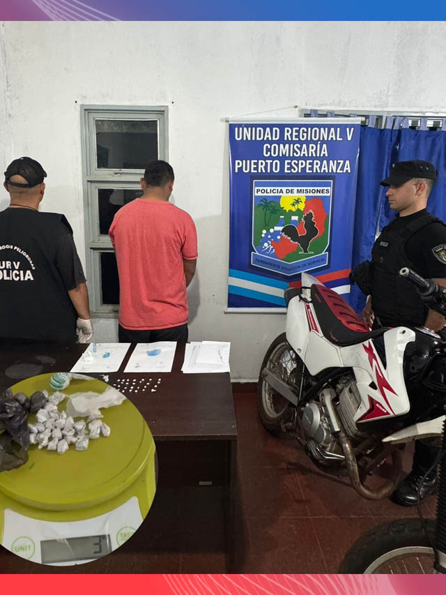 AGENCIA MISIONES.UNO | Un joven de 22 años fue detenido en Puerto Esperanza tras intentar evadir un control policial cuando circulaba en motocicleta. En su poder hallaron 32 envoltorios con estupefacientes, cuyo aforo supera los 8 millones de pesos.