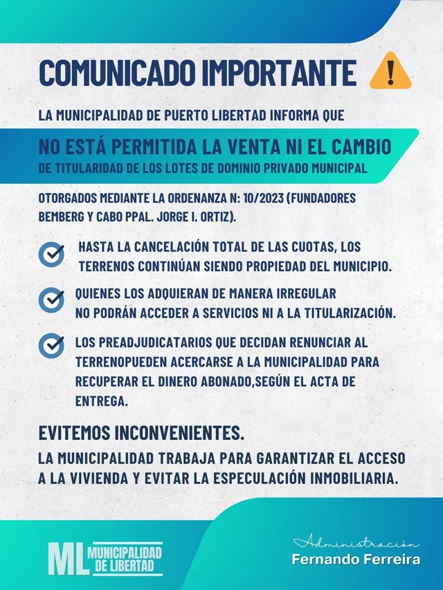 AGENCIA MISIONES.UNO | La Municipalidad de Puerto Libertad informó que no está permitida la venta ni el cambio de titularidad de los lotes de dominio privado municipal adjudicados mediante la Ordenanza N° 10/2023, correspondiente a los sectores Fundadores Bemberg y Cabo Principal Jorge I. Ortiz.