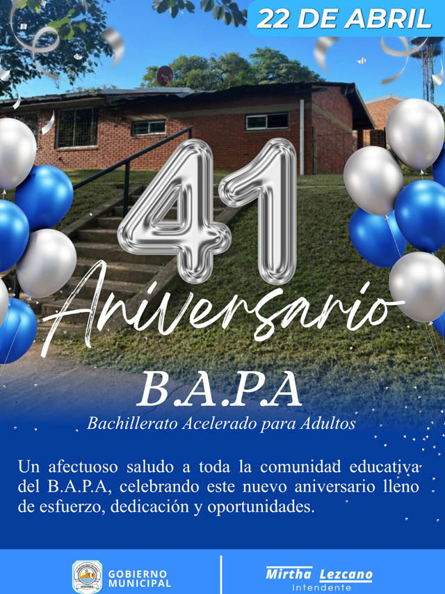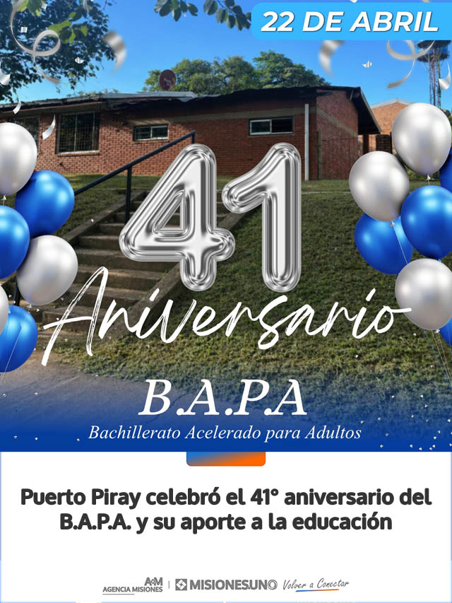 La Municipalidad de Puerto Piray destacó el 41° aniversario del B.A.P.A., reconociendo su trayectoria en la formación de jóvenes y adultos que eligen retomar y completar sus estudios.