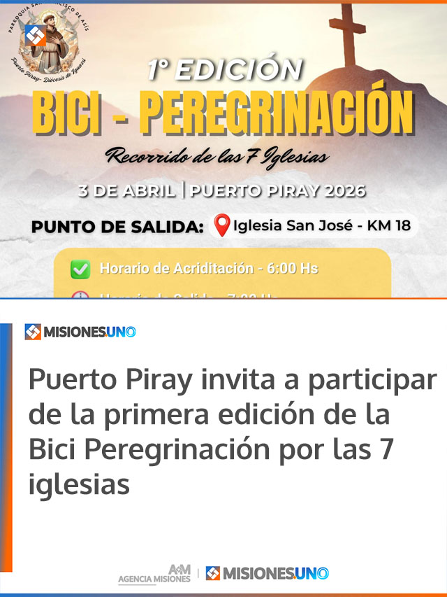 AGENCIA MISIONES.UNO | La localidad de Puerto Piray organiza la primera edición de la Bici Peregrinación, un recorrido por siete iglesias que busca promover la reflexión, el encuentro comunitario y la actividad al aire libre.