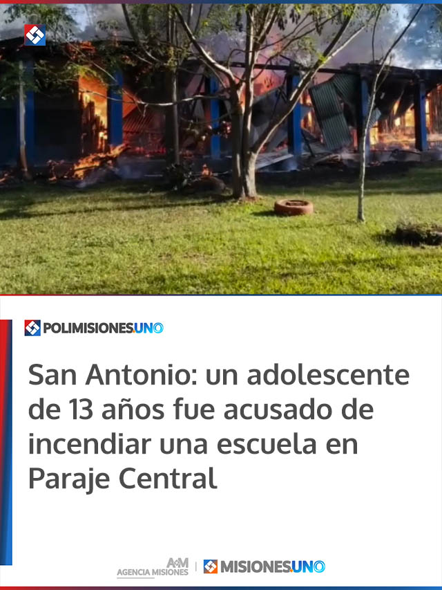 AGENCIA MISIONES.UNO | Un menor de 13 años fue señalado como presunto autor del incendio intencional que destruyó por completo la Escuela N.° 102 en Paraje Central, en la localidad de San Antonio. El edificio, con 48 años de antigüedad, fue consumido totalmente por las llamas.
