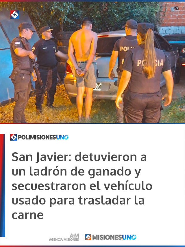 AGENCIA MISIONES.UNO | La Policía detuvo a un joven de 28 años por un hecho de abigeato en San Javier, incautó el auto utilizado para el traslado y recuperó restos del animal faenado, en el marco de una investigación que continúa para identificar a otros implicados.