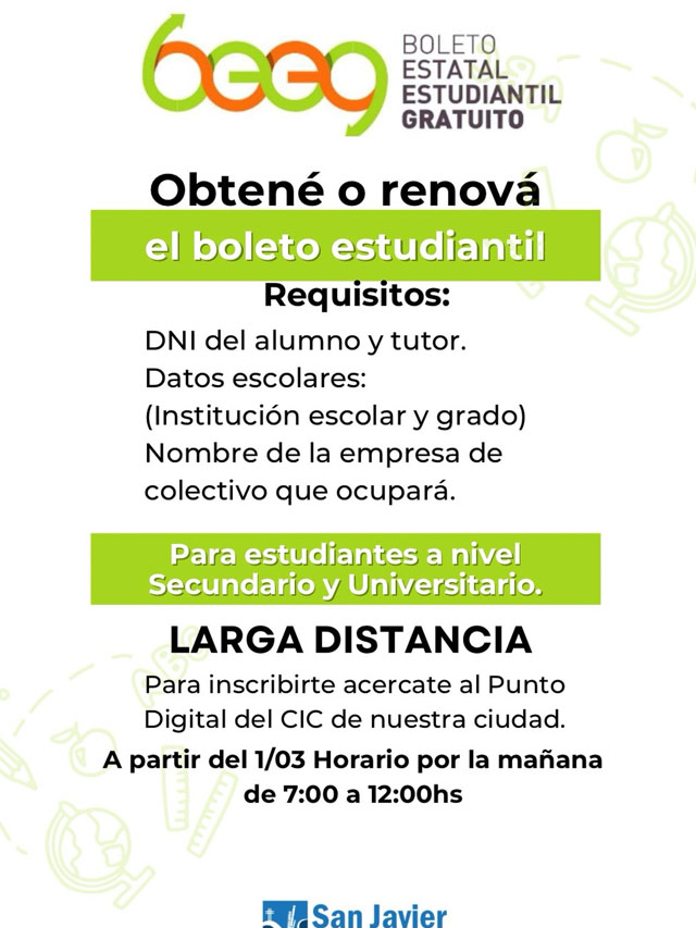 AGENCIA MISIONES.UNO | Desde el 1 de marzo estará habilitada la inscripción para obtener o renovar el boleto estudiantil en modalidad Larga Distancia en San Javier. El trámite se realizará en el Punto Digital del CIC, de 7:00 a 12:00 horas, y está destinado a estudiantes de nivel Secundario y Universitario.