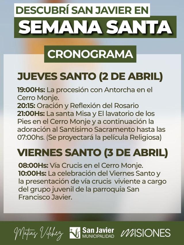 AGENCIA MISIONES.UNO | La localidad de San Javier presentó el cronograma de actividades para Semana Santa, con una agenda pensada para el disfrute de vecinos y visitantes en un entorno de encuentro y tradición.