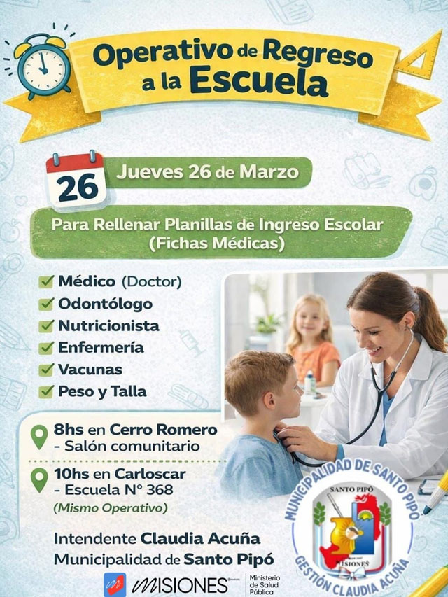 AGENCIA MISIONES.UNO | La Municipalidad de Santo Pipó llevará adelante un nuevo Operativo de Regreso a la Escuela este jueves 26 de marzo, con controles médicos y servicios gratuitos destinados a estudiantes.